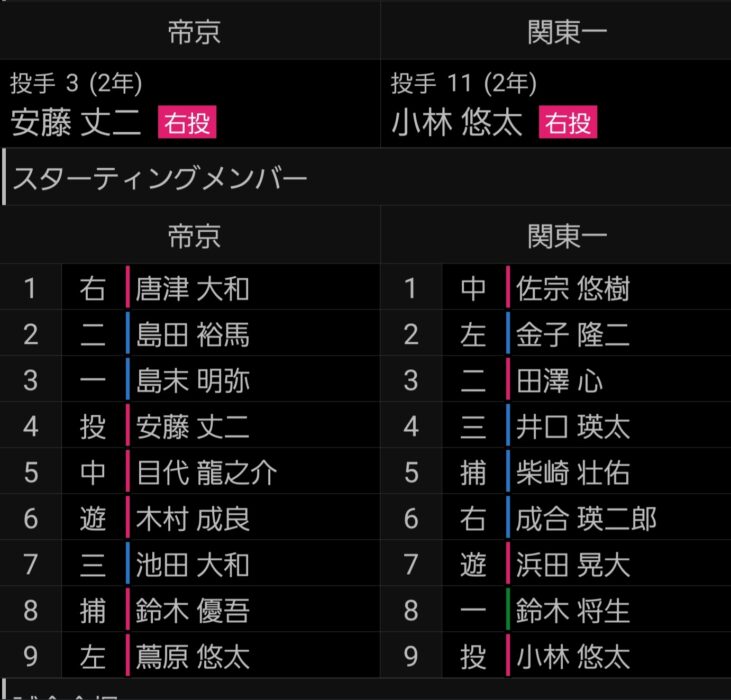 【vs関東一】@神宮 2025/11/9 秋決勝 1(右)唐津 2(二)島田 3(一)島末 4(投)安藤 5(中)目代 6(遊)木村 7(三)池田 8(捕)鈴木 9(左)蔦原content_copy Comment ID: 22772