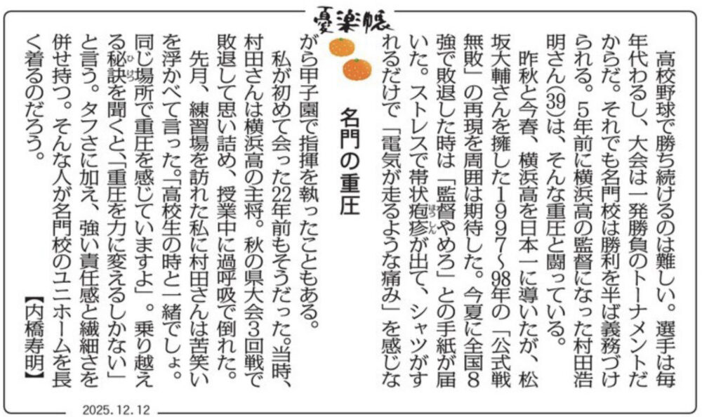 • 横浜高校監督の記事です 強豪校の宿命でしょうか 金田監督もさぞ大変な日々を過ごされたと思います 秋季大会優勝本当におめでとうございます 毎日新聞関西版の記事です