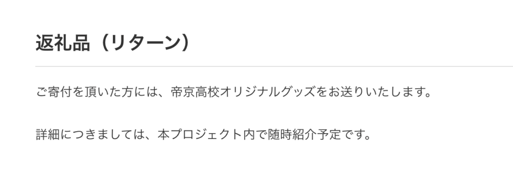 寄付したくてクラファンのページ見たけど いくら以上寄付したら返礼品もらえるか書いてなくて困ってしまう https://yellz.jp/detail/130492/project/476/ 横浜高校は5000円以上って書いてるから集まりやすいんじゃないかなcontent_copy Comment ID: 24061