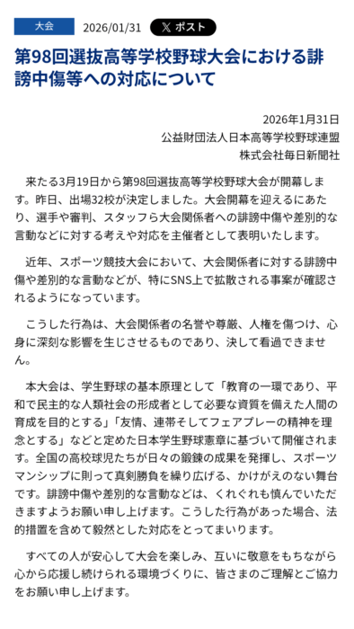 応援以外の否定的コメントマイナスコメントがあれば、私も日本高野連に連絡します。