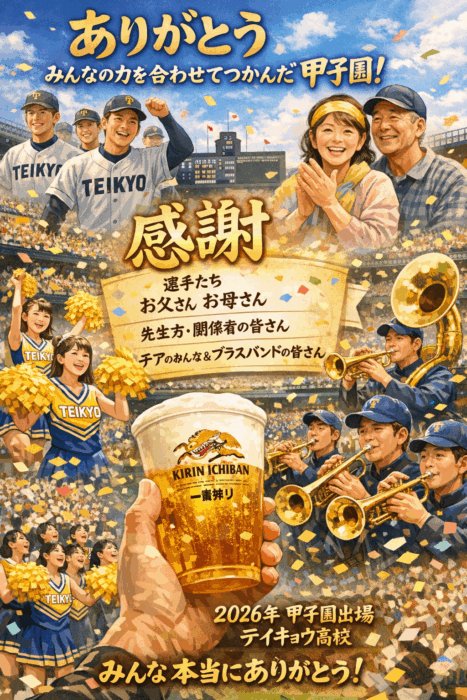 選手はもちろんお母さんお父さん、学校関係者のみなさん、忘れちゃいけない華を添えてくれるチア、ブラスバンドのみなさん、本当にありがとう!!!!! そして甲子園で帝京の試合を観ながら飲む一番搾りは最強。 ってのをChat GPTに作ってもらったらこうなりました。笑 今思えばAM3:00に起きて飛行機で行ったのもミラクル幸せっす。content_copy Comment ID: 25375